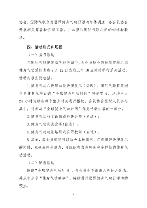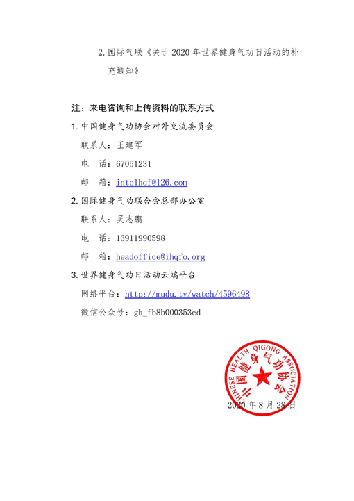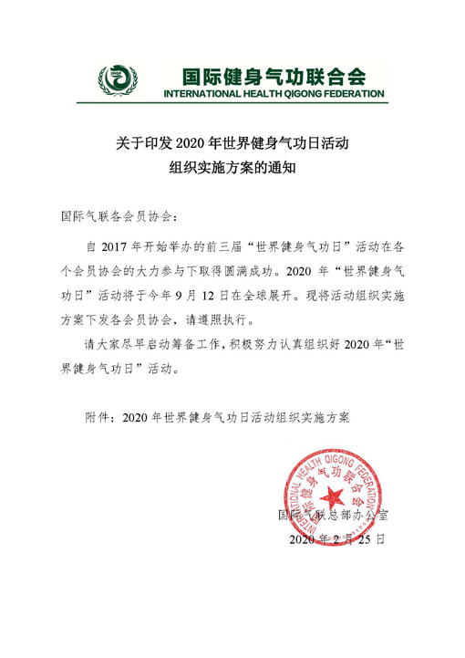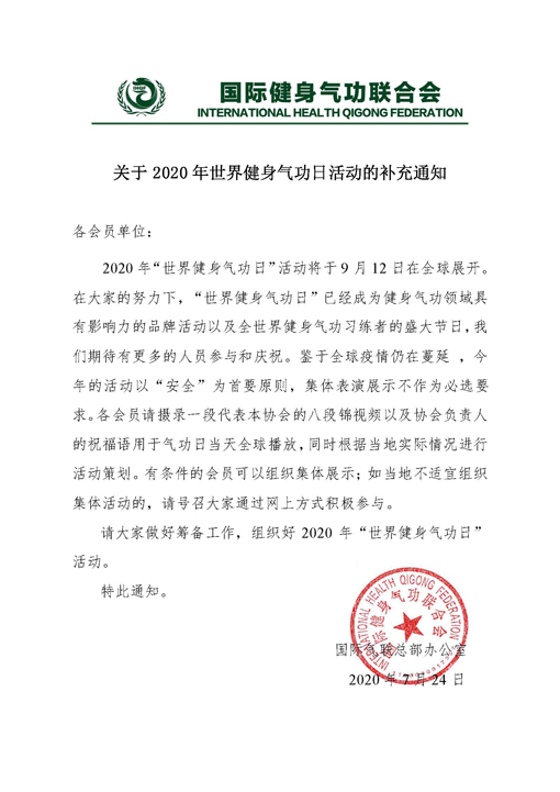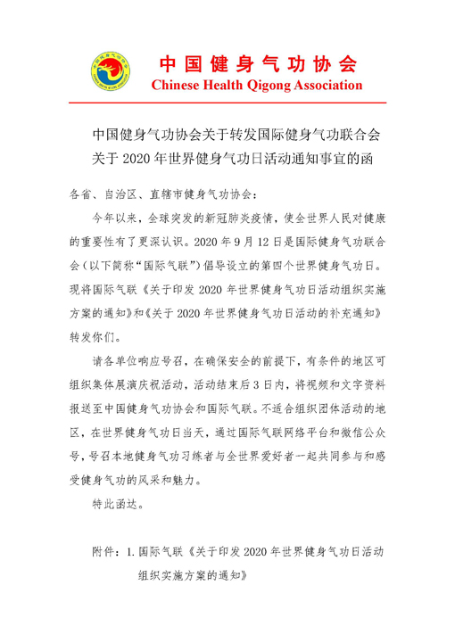 中国健身气功协会关于转发国际健身气功联合会关于2020年世界健身气功日活动通知事宜的函