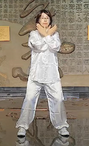 接上式。两手胸前交叉;然后,两臂外展至体侧成侧平举,同时提踵站立。动作重复6次。