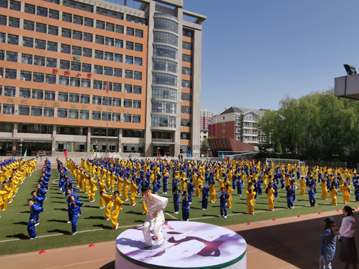 在明媚灿烂的阳光下,在韵律十足的音乐声中,内蒙古呼和浩特市新桥小学800多名朝气蓬勃的小学生们身穿黄色和蓝色练功服在大操场展示着由国家体育总局健身气功管理中心组织编创的《小学版校园五禽戏》和新桥小学自编的《三字经武术操》、《太极拳》,孩子们招招有力,动作整齐,声声震耳,尽显莘莘学子们的朝气与活力。