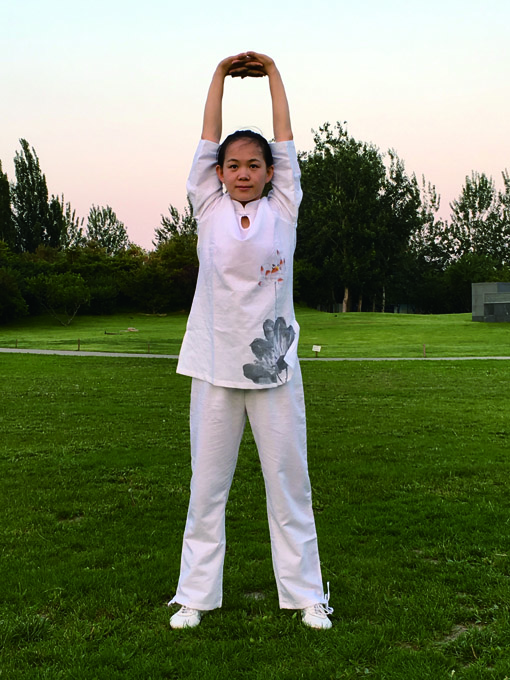 保持两脚开步站立,双手掌心向上交叉于腹前;上托于胸前,翻掌继续向前上方托起,目视两掌,下额朝向双手;随即下额微收,双掌继续向上撑起。接下来两手慢慢打开,于体侧下落,还原合抱动作。一上一下为一遍,重复两遍。